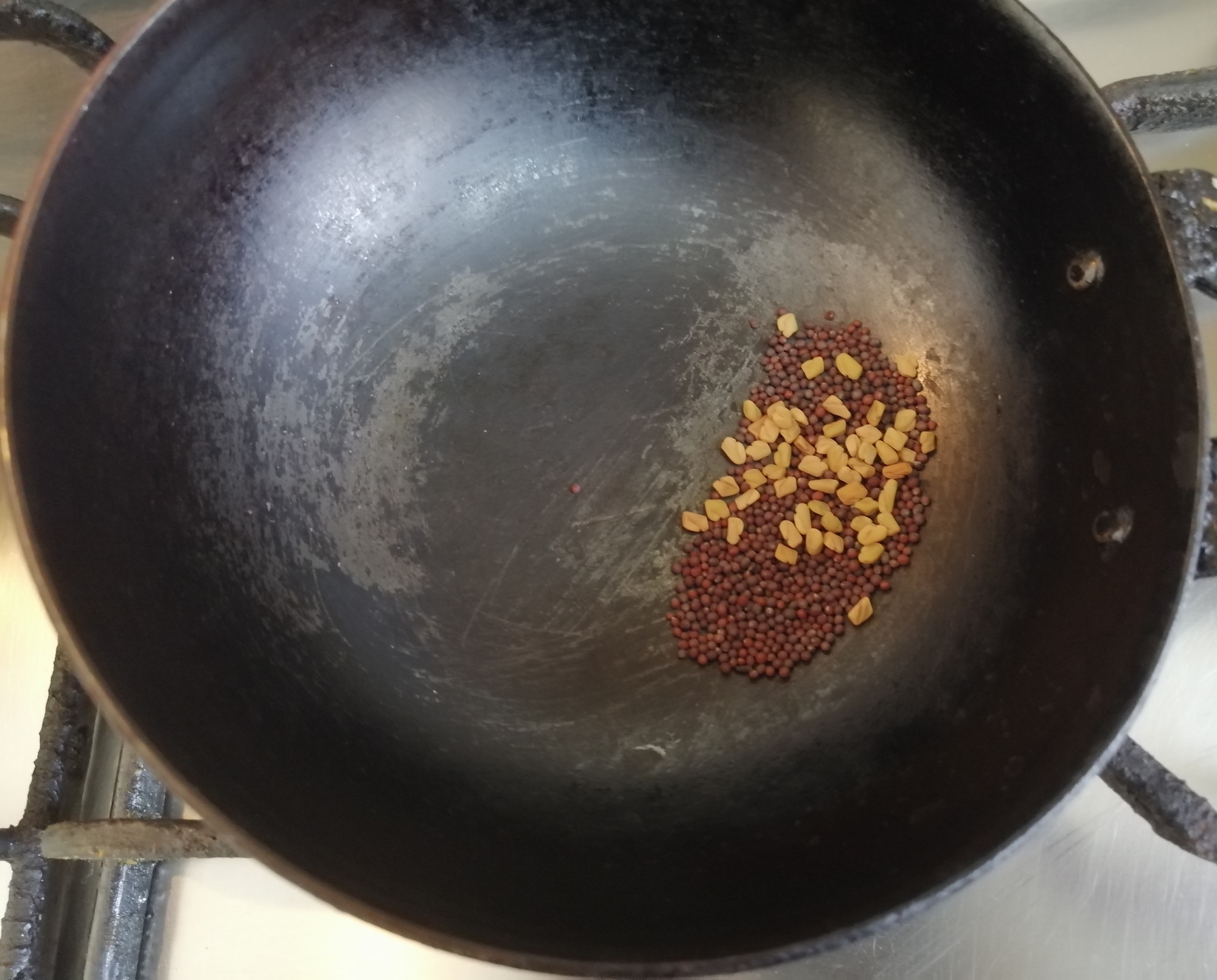 Then dry roast mustard seeds, coriander seeds and fenugreek seeds. And then ground them into a powder.